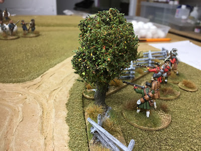 Three moves in and my British are nearly in postion lining the fence and protecting the barn, Chris F has got his Jaegers into the church and started to inflict casualties. His Indians are moving at a snails pace, perhaps too focused on being sneaky or just bad dice! My milita skirmishers are adding the odd casualty onto Chris's formations, meanwhile Chris has opened a huge 26 dice volley onto one unit of skirmishers at long range and inflicted just the one casualty, he is now pretty stuck at long range having to reload and fire rather than close.