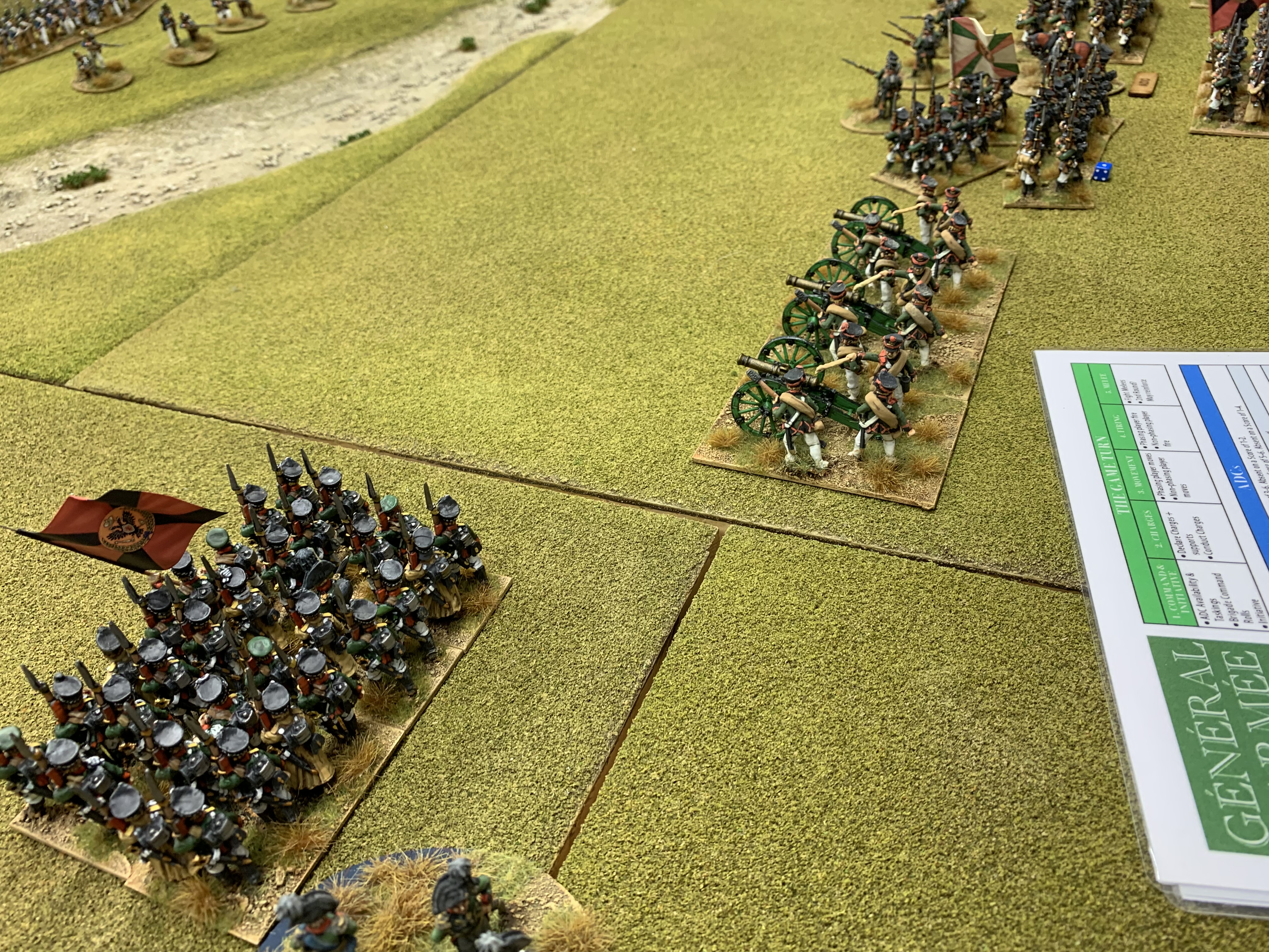 Each side has a number of dice they can roll to get extra things. ADC's typically who can re-roll failed orders. Given that all units need an order to do anything except fire these are pretty useful.Steve and Chris occupy each village with a battalion and set reinforcements behind them, their left flank is covered by a small brigade of fo0t and another of horse with one of the 6 pounder batteries. The French under Chris Con their right have a battery between the two villages and a larger cavalry brigade covering the extreme flank.