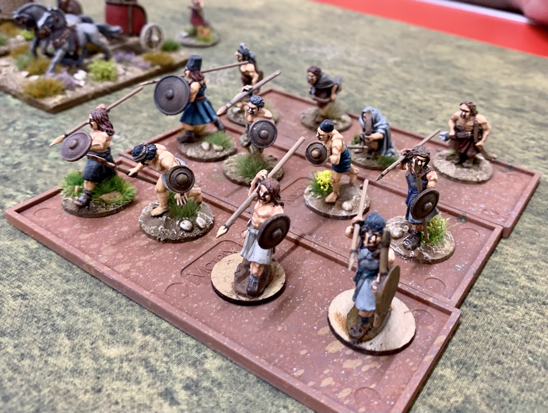 I still dont have enough figures to get the best from the rules which can be used for very large battles indeed, I do have plenty left to paint, but otherwise we think they are good fit with their focus on rewarding the heroic behaviour of the Leaders and Champions and optional extra rules for magic, enhanced weapons, Shamen casting curses etc..Chris Flowers would command a smaller force holding a hill. He has A level 3 leader and a level 1 and level 2 Champion, 2 units of javelin armed skirmishers, 1 of archers, 1 of light cavalry, 2 of warriors and 1 of Warriors Heavy Infantry. Thats those chaps in decent gear at the front with swords and axes.